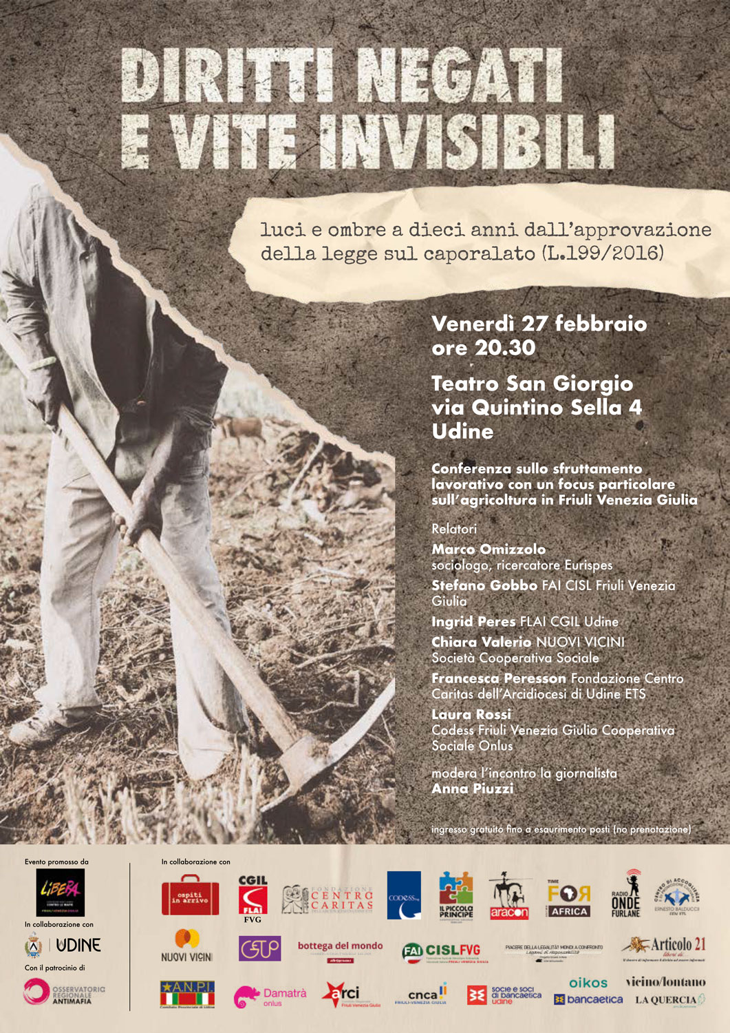 Diritti negati e vite invisibili | Tavola rotonda su sfruttamento lavorativo e caporalato in Friuli-Venezia Giulia a dieci anni dalla Legge 199/2026. Intervengono Marco Omizzolo, sociologo e ricercatore Eurispes; Stefano Gobbo, FAI CISL Friuli Venezia Giulia; Ingrid Peres FLAI CGIL Udine; Chiara Valerio NUOVI VICINI Società Cooperativa Sociale; Francesca Peresson, Fondazione Centro Caritas dell’Arcidiocesi di Udine ETS; Laura Rossi Codess Friuli Venezia Giulia Cooperativa sociale onlus | Venerdì 27 febbraio alle 20.30 al Teatro San Giorgio, Udine | Evento organizzato da Libera Friuli Venezia Giulia (qui la locandina).
