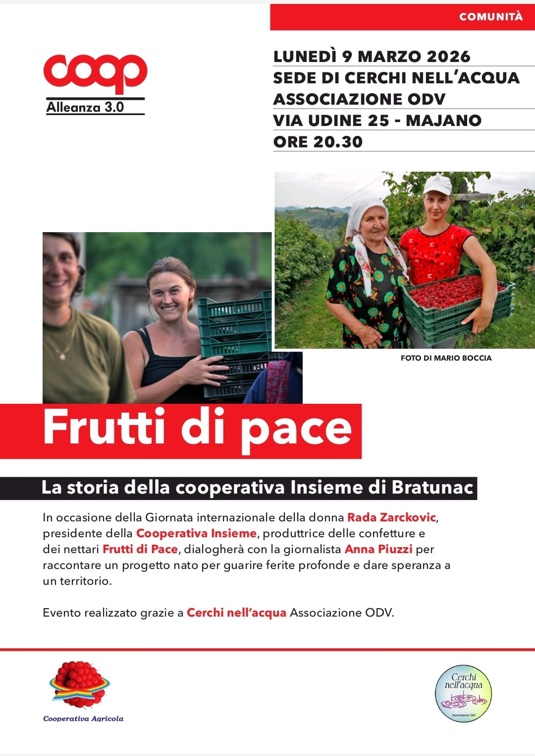 Frutti di pace. La storia della cooperativa di Bratunac | Dialogo con Rada Zarckovic per raccontare – in occasione della Giornata internazionale della donna – la storia della Cooperativa insieme, a Bratunac, in Bosnia Erzegovina | Lunedì 9 marzo alle 20.30 a Majano, nella sede dell’associazione Cerchi nell’acqua, in via Udine 25 (qui la locandina dell’evento)